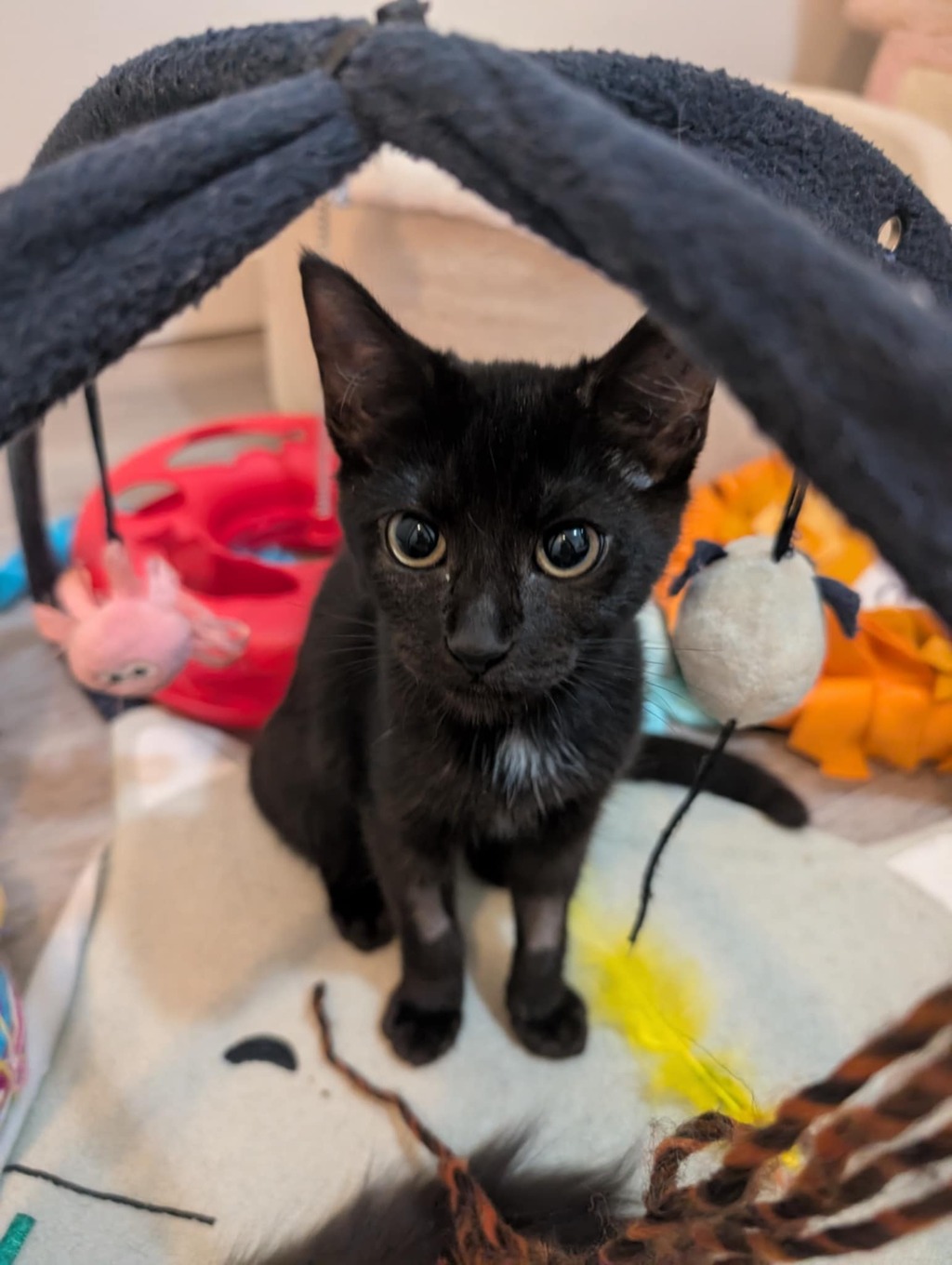 Meet Mercury, a dazzling little black kitten with a heart as big as the universe! This beautiful baby girl is full of energy, curiosity, and charm. With her silky midnight coat and twinkling eyes, Mercury is as mysterious and magical as her name suggests.