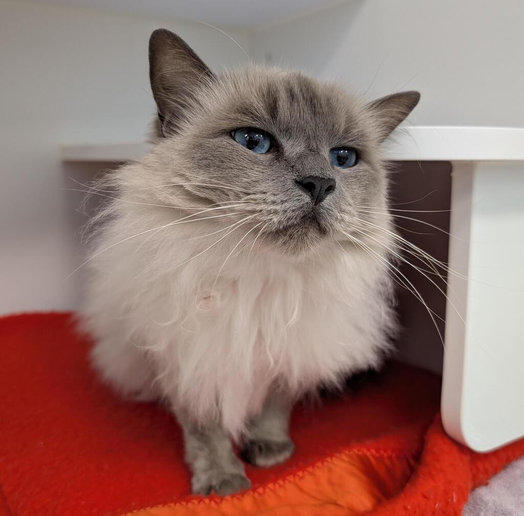 Meet Cleo! This sweet, spunky Ragdoll is full of energy and personality. She's a playful little dynamo who absolutely loves chasing toys and being groomed to perfection. While she's not one to curl up on your lap for long cuddles, she's all about being close, often opting to sit next to you rather than on top of you. Cleo is a fun-loving girl who thrives in a home where she can stretch her legs and keep her sharp mind engaged. If you're looking for a cat who's as energetic as she is sweet, Cleo is the one for you!