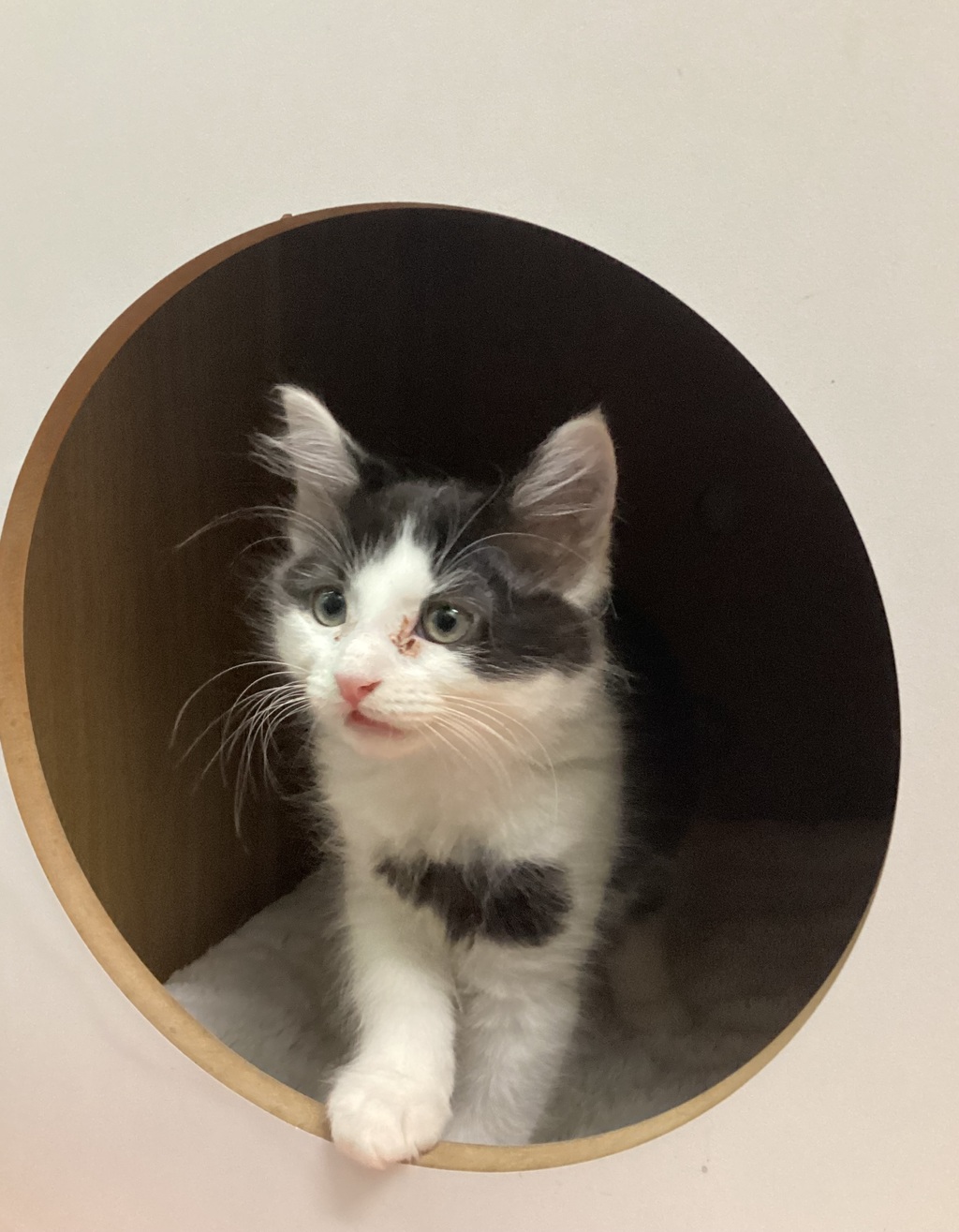 Meet Melvin, an adorable male kitten with soft medium-length fur in a charming black and white coat. This little guy is as sweet as he is handsome, with bright eyes full of curiosity and a playful spirit that will melt your heart. Melvin came into the shelter alongside his loving mum and siblings, and he's been thriving in our care ever since. He enjoys exploring his surroundings, chasing toys, and curling up in cozy spots for a good nap. Melvin is affectionate, gentle, and ready to find a forever home where he'll be showered with love and attention. He gets along well with other cats and would do wonderfully in a family that can offer him both playtime and snuggles. If you're looking for a loving companion with a playful purr-sonality, Melvin might just be the perfect addition to your home. Come meet this charming boy-you're sure to fall in love!