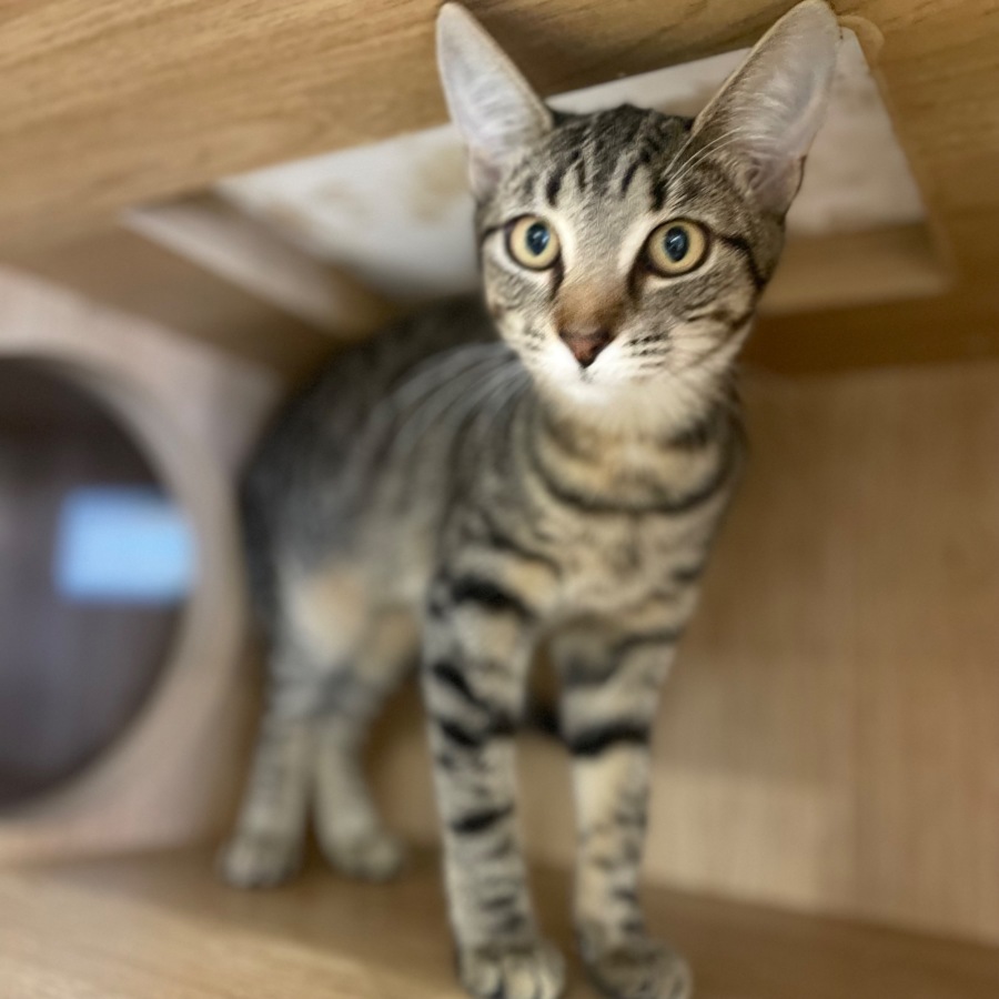 Chai is a domestic shorthair cat. She has a beautiful tabby coat. These breeds are always super affectionate and are easy to care for.