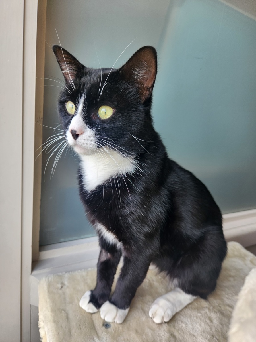 Meet Mr. Catsby, the embodiment of elegance and tranquility wrapped in a dapper tuxedo coat. His placid demeanor and relaxed attitude make him the perfect companion for anyone seeking a gentle and soothing presence in their life.