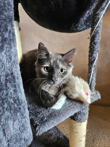 Hello, lovely humans! My name is Tabitha, and I'm a 4-month-old female Domestic Medium Hair kitten. Despite my young age, I have a lot of love to give. I'm looking for a forever home with humans who are at least 6 years old, who can give me all the care, playtime and cuddles I can handle. I have a soft, fluffy coat that you're going to love petting. I'm a curious little lady who enjoys exploring my surroundings and playing with my toys. I have a sweet, playful nature and a soft purr that will melt your heart. I'm still a kitten, so I'm full of energy and love to play. I'd love a home with lots of toys and room to run around. But don't worry, after a good play session, I'm all about snuggling up for a nap. I promise to brighten up your life with my playful antics and sweet purrs. All I need is a loving family to call my own. Are you the one I've been waiting for? I can't wait to meet you!