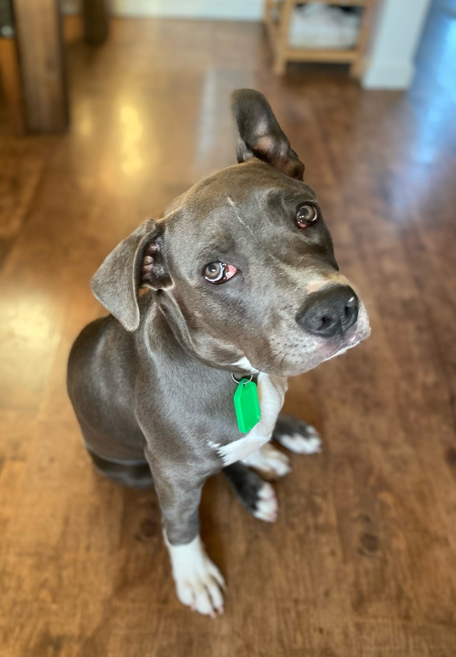 Meet Cola, a gorgeous blue Staffy with the sweetest soul. He might be a little shy at first, but once he warms up, he's the biggest cuddle bug you'll ever meet! Always up for a play or snuggle with his older foster sister, Cola would love a home with another friendly, tolerant dog to show him the ropes. He could also suit a home with no dogs, but he loves company so ideally he wouldn't be left alone all the time. He's toilet trained, confident with a doggy door and has already learnt 'sit' and 'bed' (because treats = life), but he's still learning the ways of the world and will need ongoing training and socialisation. In return, you'll get endless snuggles, tail wags, and a loyal best friend for life! Cola has had surgery on eye issue that he came to us with, while the surgery was successful, he is more prone to having the eye issue reoccur during his lifetime. If you've got room in your heart (and on your couch) for Cola, apply today!