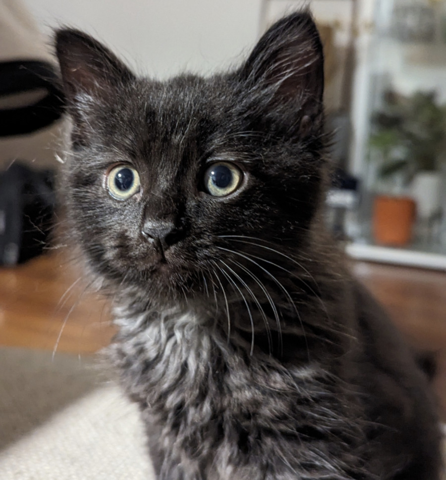 Always up for a game, he enjoys running and sliding around chaotically chasing toys, human feet and other kittens :) Bushells also loves a staring contest with his foster carers (which he invariably wins). It's hard to tell if he's deep in thought or struggling to put one together... but we adore him either way!