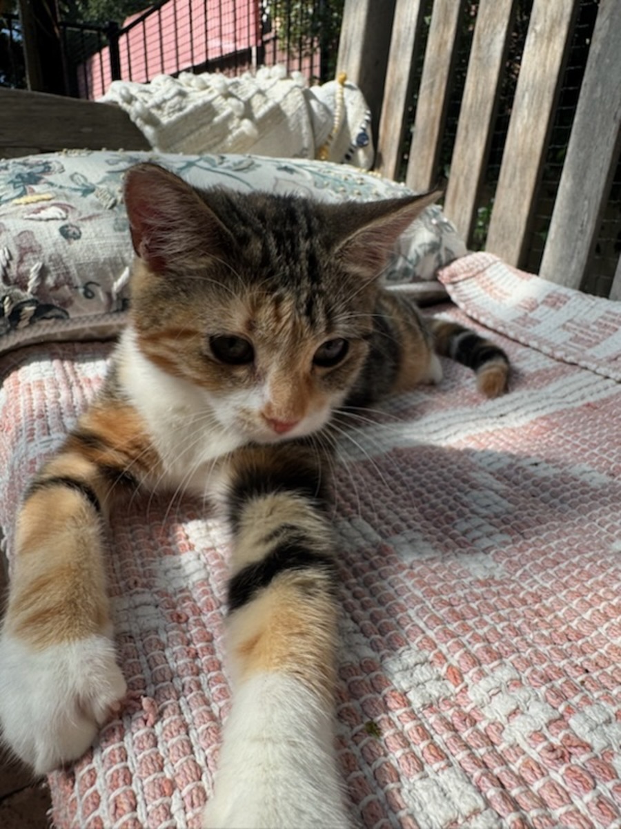 Calypso is a beautiful calico kitten with the softest fur and the sweetest, most soulful eyes. Rescued from a local council shelter, she’s still learning that the world is a safe and kind place – and she’s making gentle progress every day.