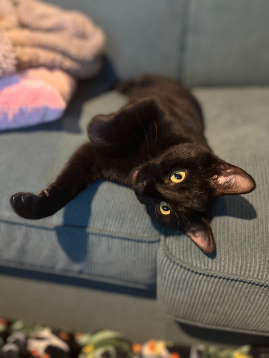This sleek and stunning black beauty is about 8–9 months old and full of personality! Jasmine is confident, curious, and always ready for her next adventure. Whether she’s chasing feather toys with lightning speed or wrestling with her foster brother, she brings her spunky energy and joy wherever she goes.