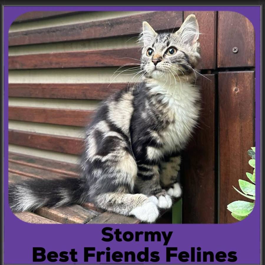 Stormy is a delightfully cuddly kitten with a curious heart and a love for the coziest corners of the house. Her absolute favorite place to nap is the bathroom sink watching water run down the shower glass. When she’s not curled up there, you’ll find her burrowed under blankets, peeking out with sleepy eyes, or hiding away in drawers she’s sneakily wriggled into. Stormy adores her food and sun-baking in the mornings on the end of the bed.