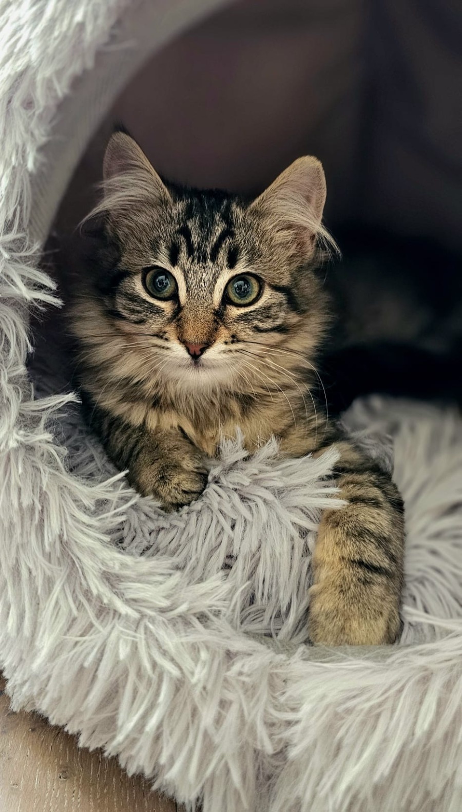Tabitha is a playful and curious little kitten with soft, velvety fur and bright, twinkling eyes full of mischief. She’s always exploring, whether it’s chasing shadows, pouncing on toys, or curling up in cosy corners for naps.