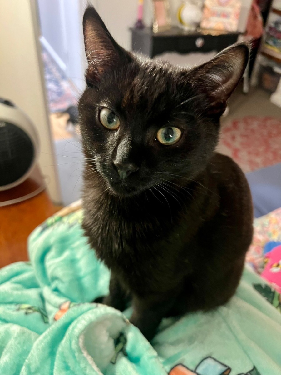 DJ is a sleek, all-black kitten with glossy fur that shimmers under the light like polished midnight. His eyes are bright amber, full of curiosity and mischief, always scanning for his next playful adventure.