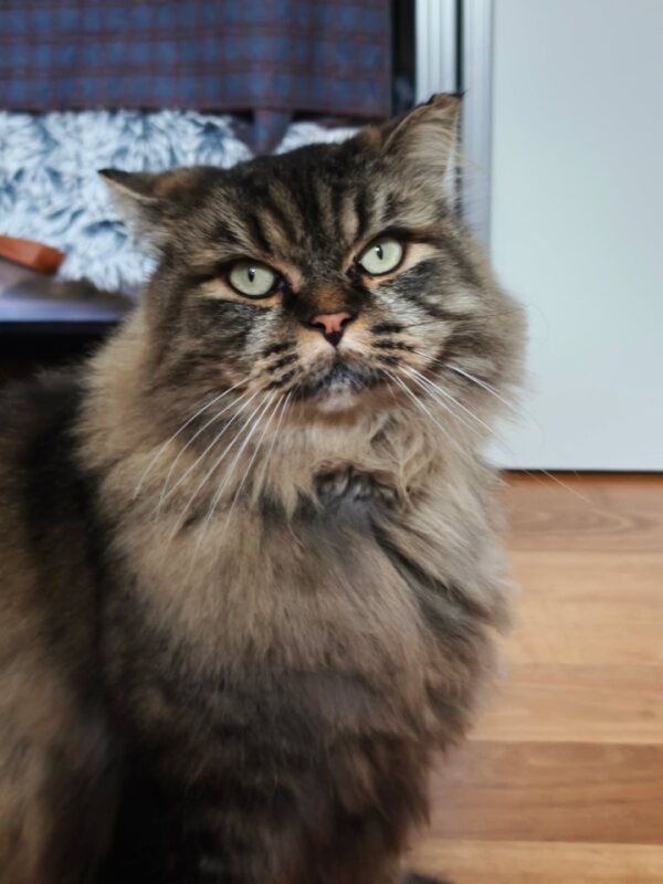 I’ve got a beautiful, long coat that needs regular brushing, and I wear it like a king. When I walk into a room, I carry myself like a lion—bold, proud, and with a mighty meow.