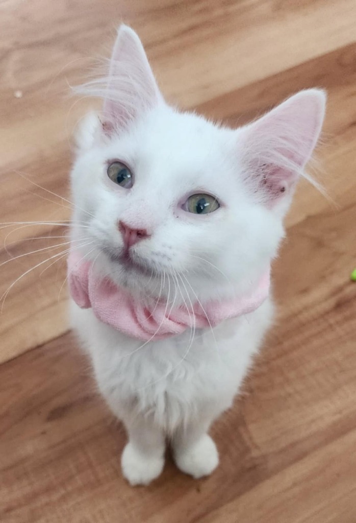 Meet Gizmo—just like her namesake, she’s small, fluffy, and totally irresistible! This playful little girl is mostly white with a soft grey smudge on her head, like a mischievous whisper of personality. She's full of zoomies, purrs, and charm—and don’t worry, she thrives in daylight and loves water in her bowl!