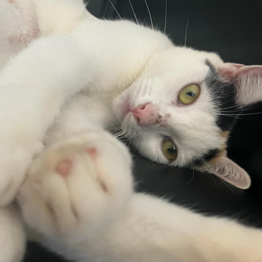 Looking to add a burst of joy and energy to your home? Say hello to Calypso, a stunning white domestic short hair with sporadic spots and a personality that shines just as brightly as her coat!
