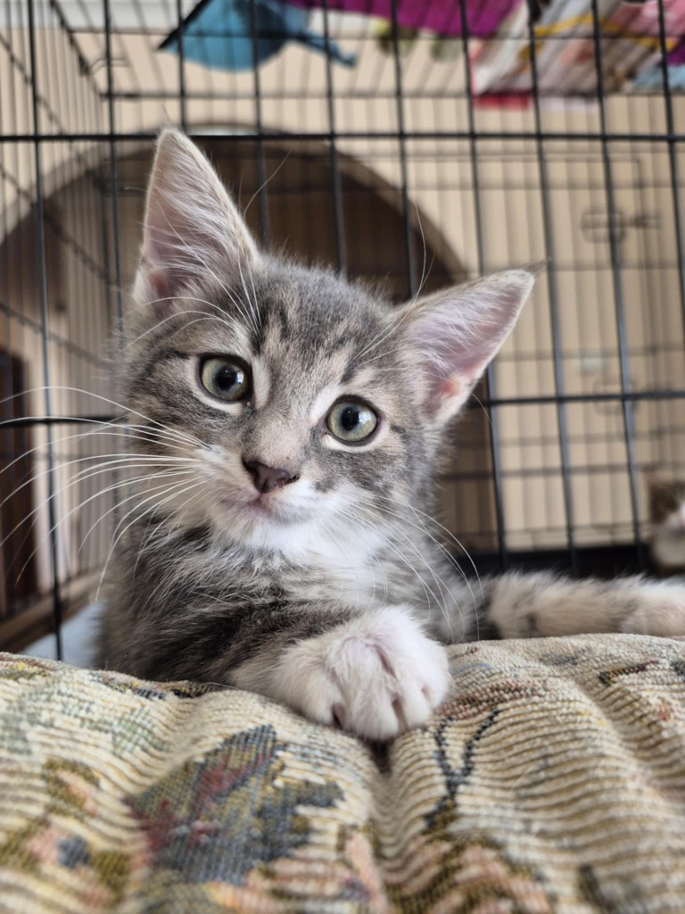 Marbles is the most confident of his siblings, exploring the house first and running amok. He loves playing up and down the side of his scratching tower before zooming around the room. When he’s calmed down, he’s a snuggly little kitten who loves curling up with his brothers. Marbles lives with other cats, dogs and kids so he’ll slot into any family!