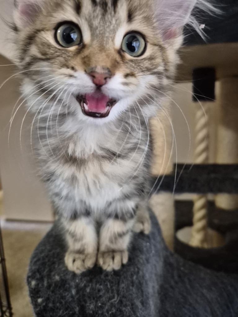Jerry is an incredibly fluffy little kitten who adores his food and playtime. He’s a very affectionate kitten, enjoying perching on you and purring loudly. Jerry loves his people, coming straight over for food and pats. His whole body pushes into your hand and his fluffy tail pops up.