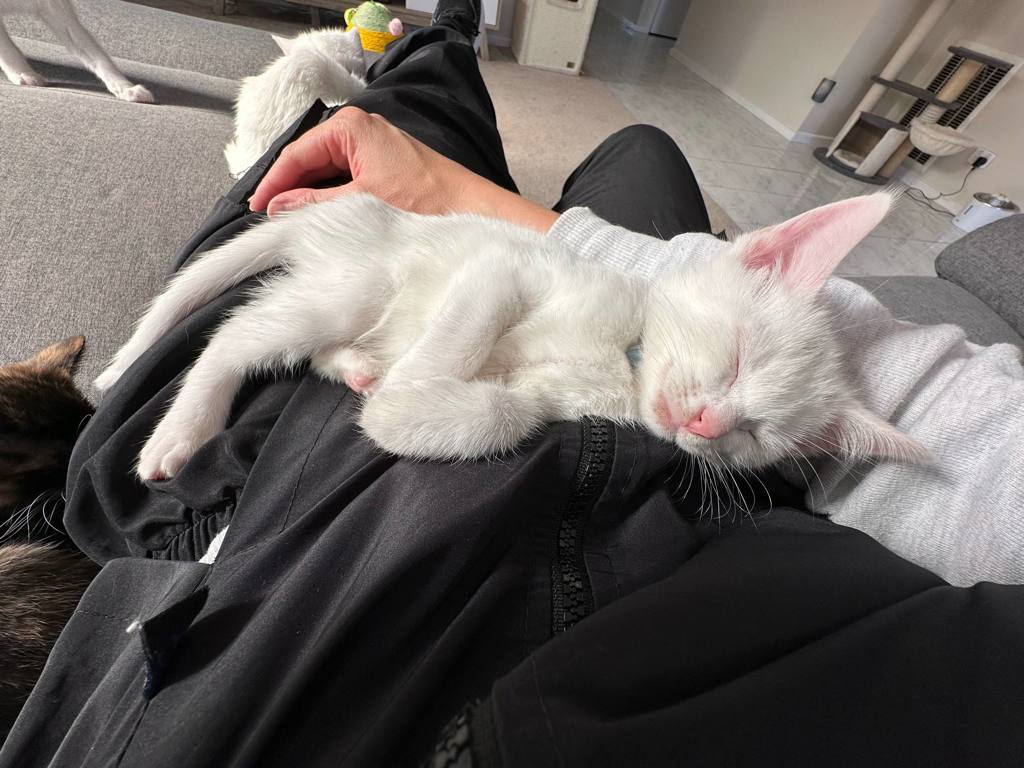 Kingston is the kind of kitten who melts into your arms and stays there. He loves to sleep on you, curl up in your lap, or stretch out along your legs like he owns the place (which, let's be honest, he kind of does). He's affectionate, cuddly, and has a special talent for making you feel like the most important person in the world.