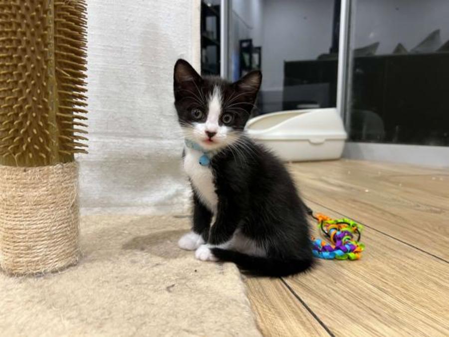 Tom is a cute and cheeky tuxedo kitten, with a love of pranking his siblings. He came into DCH care with his mama (Penelope), brothers (Wyatt and George), and sister (Abbie) from the shelter at 4 weeks old. He has thrived under DCH care, gaining weight and getting stronger. His face is all cuteness but he is very cheeky!