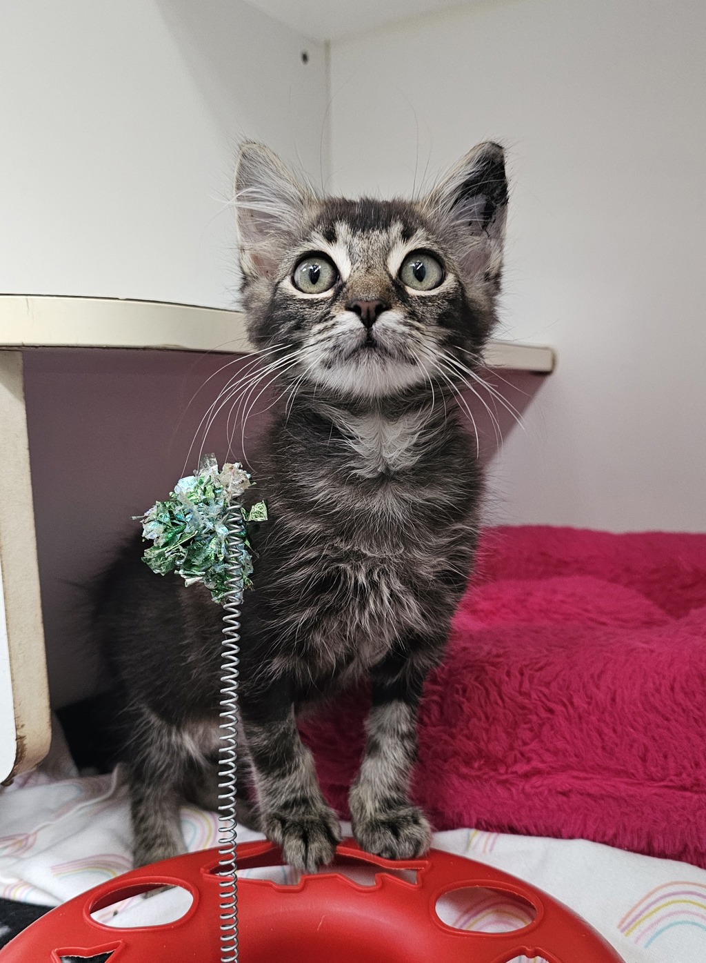 Hey there, I'm MacKey. I'm a friendly and affectionate kitten who would suit most homes! My playful paws are always ready to pounce on anything that moves. I love playing with wand toys and mysterious shadows on the wall! When I'm finished playing, I love nothing more than finding a warm lap to curl up in.