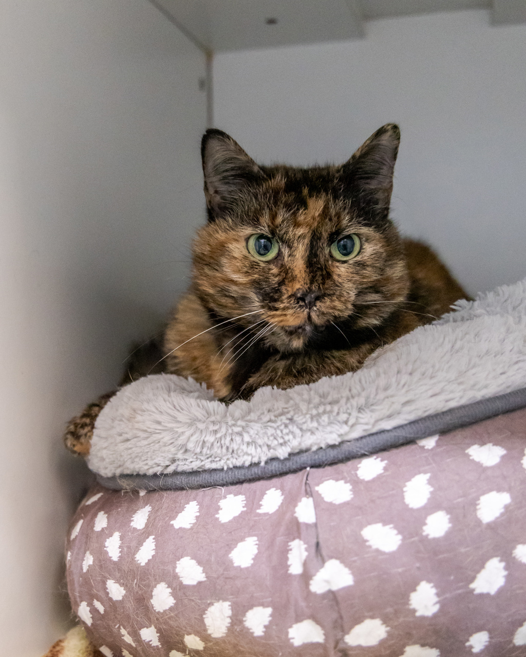 While she's not a fan of being picked up or over-handled (a lady has her boundaries, thank you very much), she adores gentle chin scratches and calm company. She's incredibly low maintenance and would thrive in a mature, peaceful home where she can truly relax and be herself.