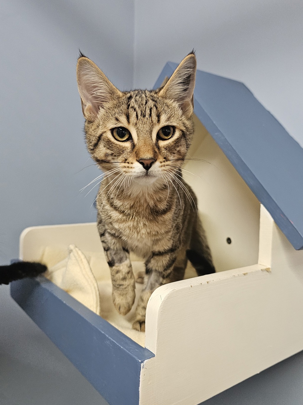Hey there, I'm Boq. I'm a friendly and affectionate kitten who would suit most homes! My playful paws are always ready to pounce on anything that moves. I love playing with wand toys and mysterious shadows on the wall! When I'm finished playing, I love nothing more than finding a warm lap to curl up in.