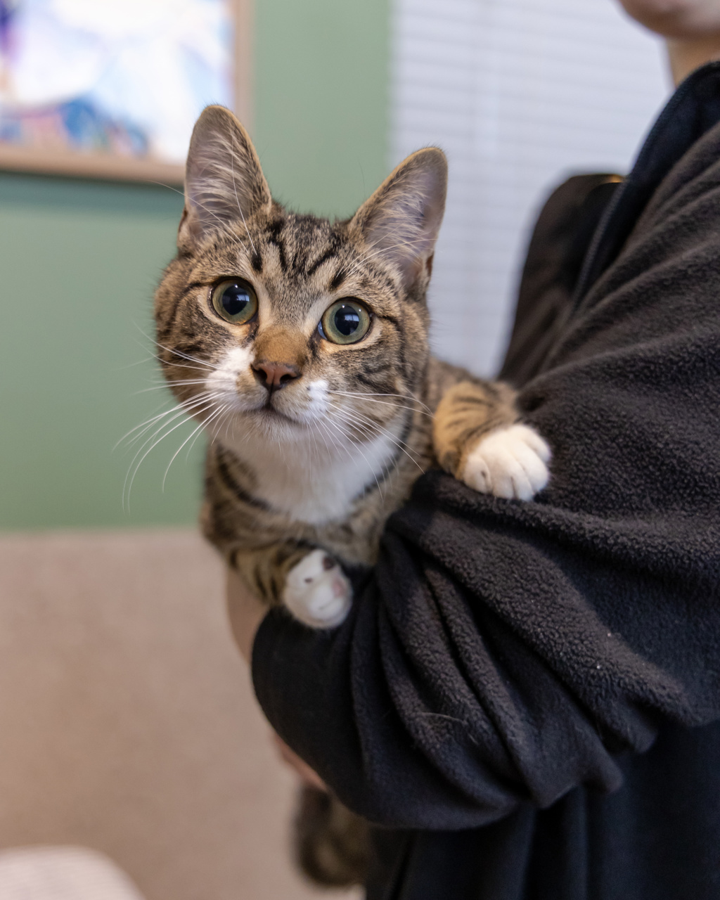 I have perfected the art of the irresistible purr. It's like my secret weapon for getting all the cuddles and chin scratches I could ever want. Life's just one big, exciting string of moments, and I'm here to make every second count - whether I'm chasing my tail or sharing some purr-fectly quiet time with my favourite humans. So, if you're up for a bundle of furry fun and a lifetime of companionship, please consider adopting me!