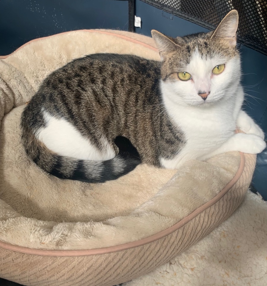 Smiggle likes her chin scratches and will lean into you for more. And when she rolls on her back and shows her belly, it isn’t a trap!! Smiggle really loves belly rubs. She loves to play with her toys and still has some kitten playfulness. She loves hanging out on the lounge with you and has been around other cats.