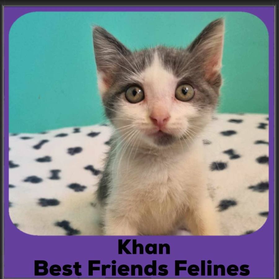 Khan is the most gorgeous friendly little gray and white kitten (I can say that about Khan and his brother, kittens can’t read! ). He loves to lay on people - in your lap or perched on your leg, rumbling with his little purr. He also loves to ‘puddle’ and nap in a pile with his siblings or the bigger kitty friends he makes. When he’s not resting or cuddly Khan loves to wrestle and sprint about playing with his siblings and toys.