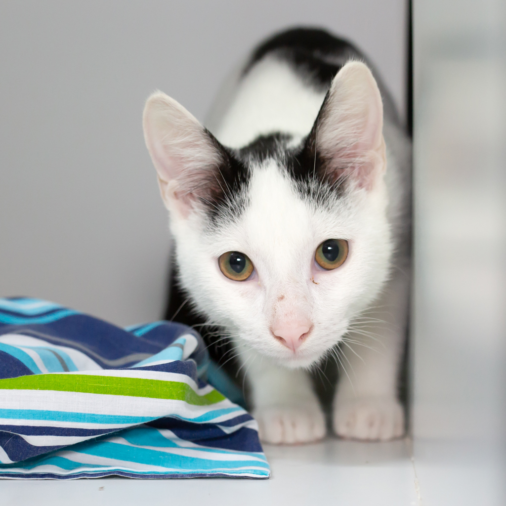 Meet Squint, a handsome white and black juvenile cat with a happy-go-lucky spirit and a whole lot of love to give! Squint is super social, adores people, and will happily chat away to keep you company. He's the type of cat who will greet you at the door, follow you around, and fill your days with affection and conversation. With his sweet nature and outgoing personality, Squint would make a fantastic companion for just about anyone!