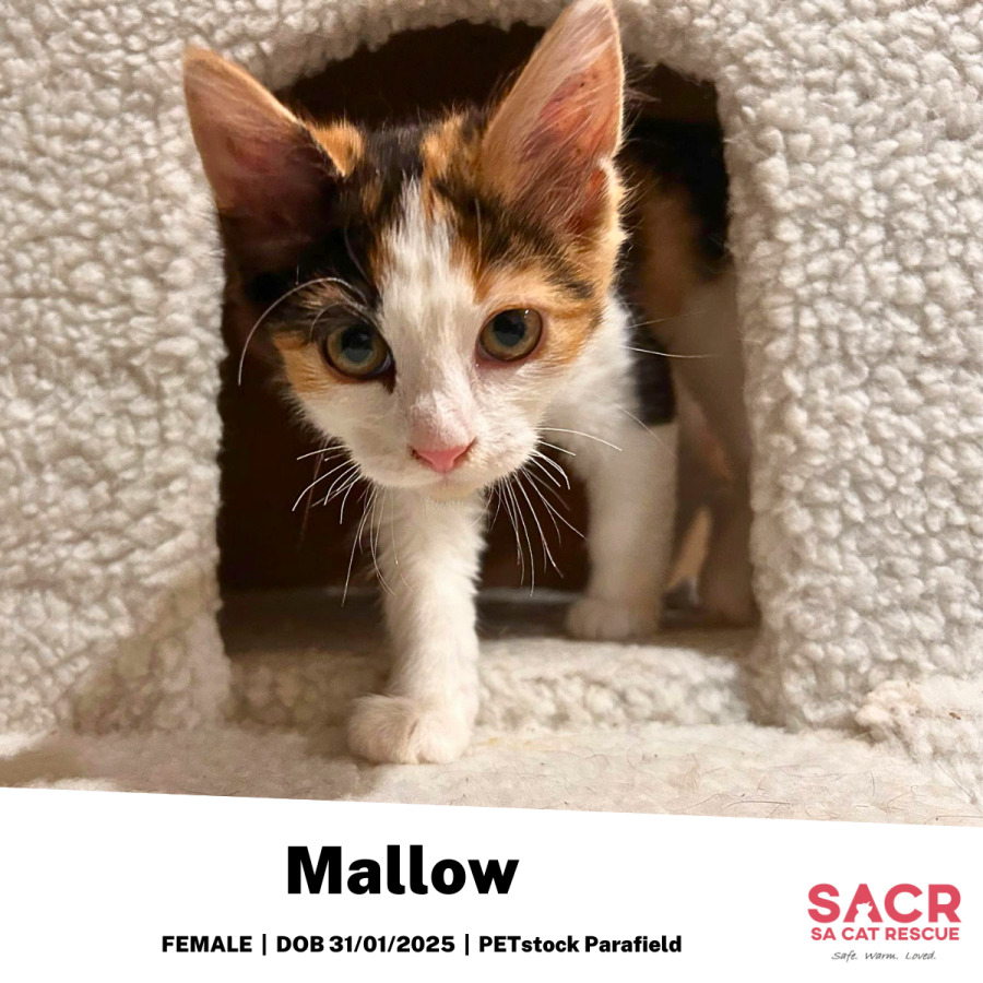 Mallow's adoption fee is $195 which includes desexing, microchipping, parasite prevention, and initial F3 vaccination.