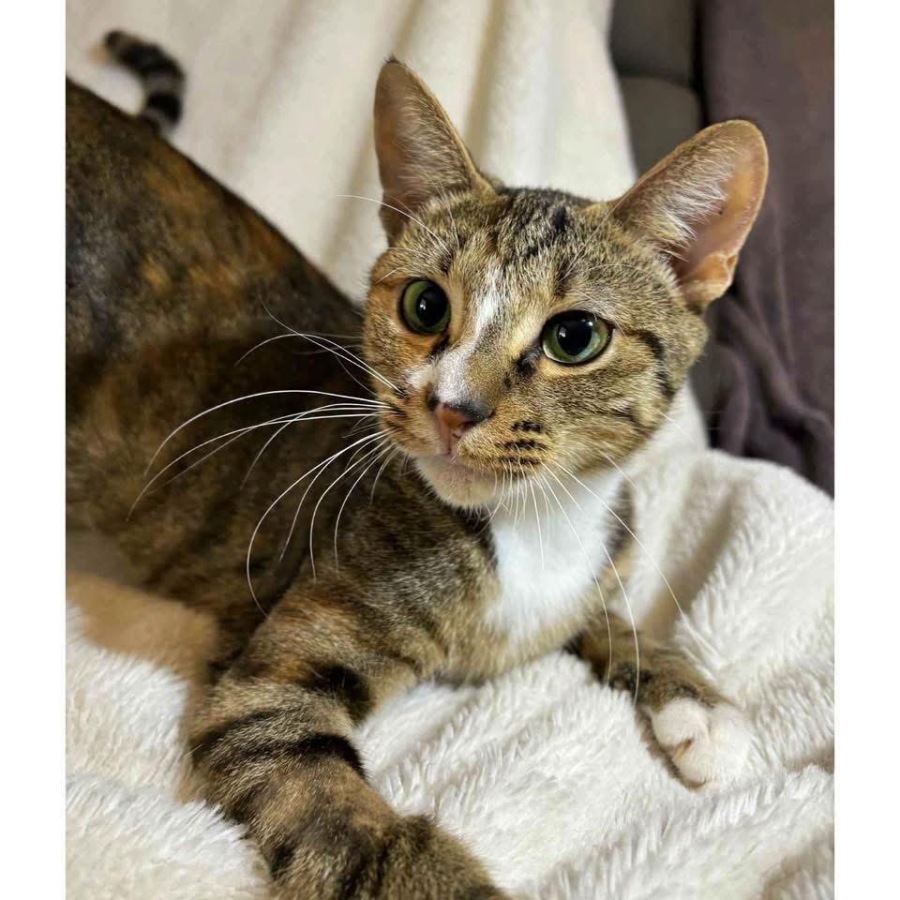 I am a chill, 'go-with-the-flow' kind of girl. I am as fast as a bullet, zooming around the house and playing with anything I can get my paws on. Although I am a very playful cat, this will not stop me from running up to you for a pat and a snuggle. I have a goofy little personality and love to entertain people with my sweet chirps and meows. I love my food and will never say no to a treat here and there!