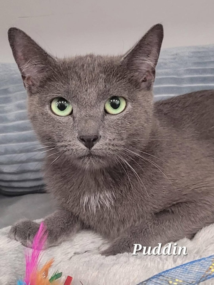 Meet Puddin, a stunning feline with mesmerizing green eyes and a soft grey coat that will steal your heart at first glance. At just over two years old, she has already shown her exceptional nurturing skills, having once been a devoted mother to her own kitten.