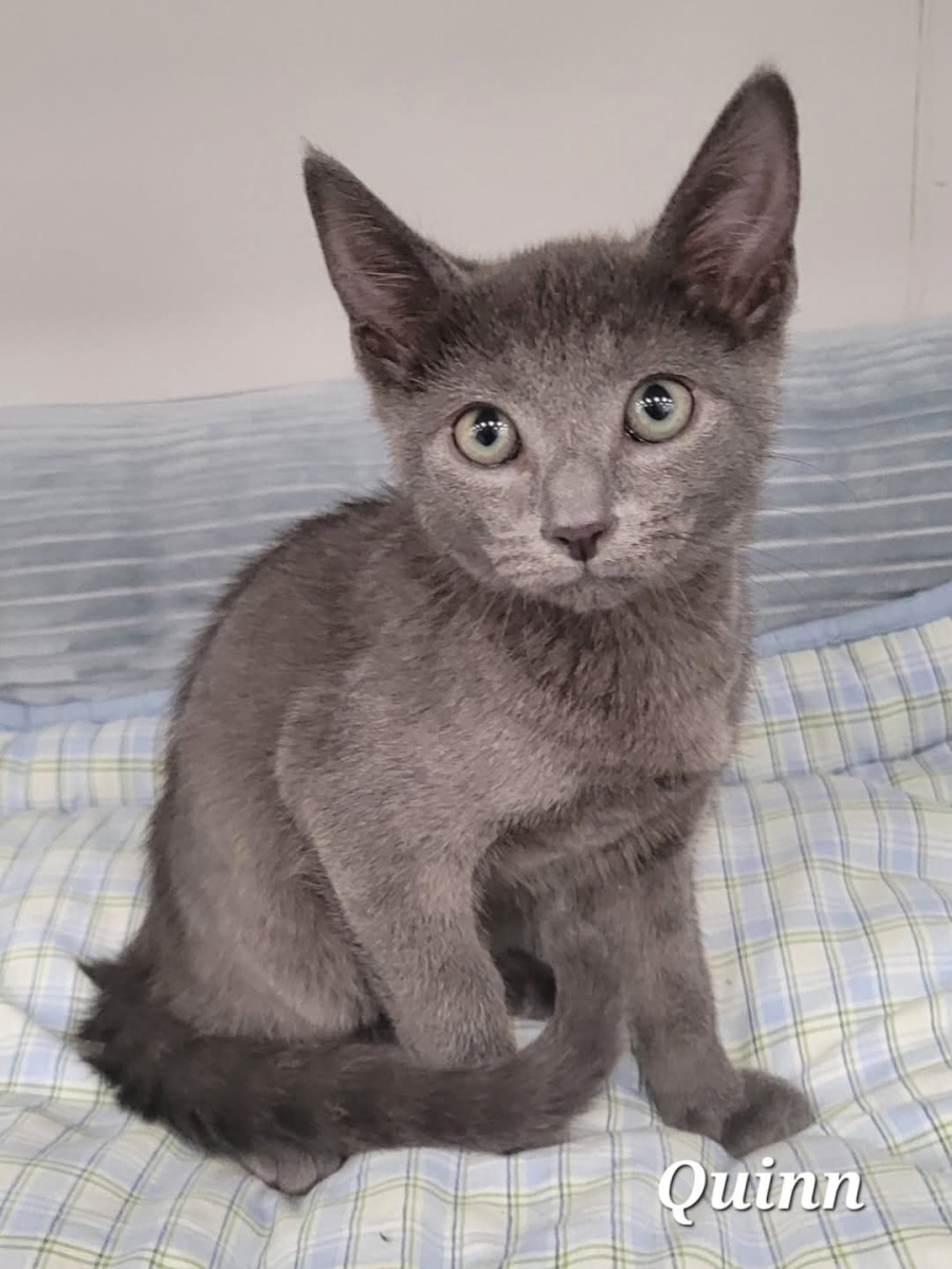 Quizmo is a playful, cuddly, shadowing kitten with a love for mischief and snuggles. A tiny panther with a big heart and an even bigger personality!