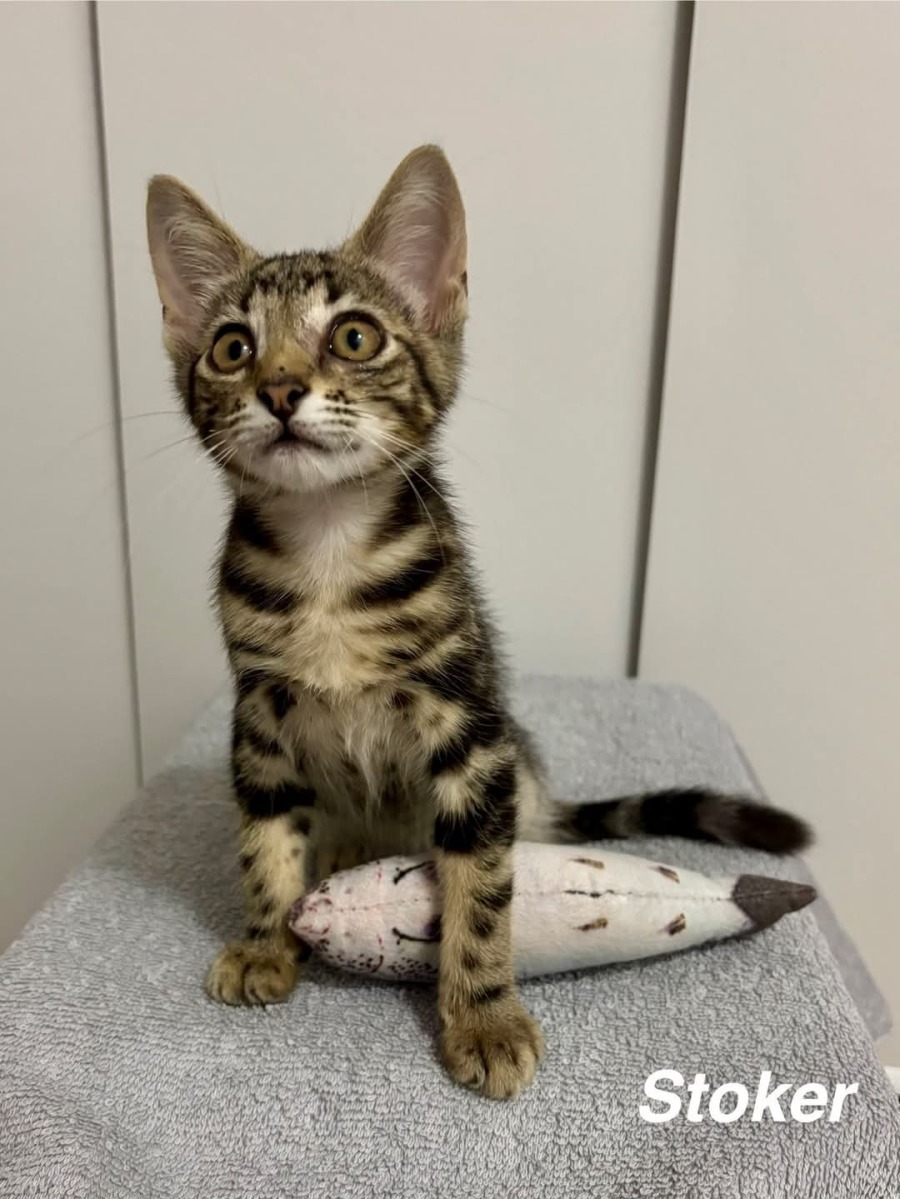 Stoker: Stoker is a handsome tabby boy, looking very much like his sister, Scout, with lovely tabby patterns. Just like his sister, Stoker is a delightful blend of playful energy and snuggly affection. He's often found right in the middle of playtime fun, wrestling with his siblings or batting at a dangling toy. When he's tuckered out, he's quick to seek out human companionship for a reassuring cuddle and nap. Stoker is looking for a family that can offer him plenty of playtime and enrichment, balanced with lots of love and snuggles. He'd be a fantastic addition to almost any loving household ready for kitten antics and affection.