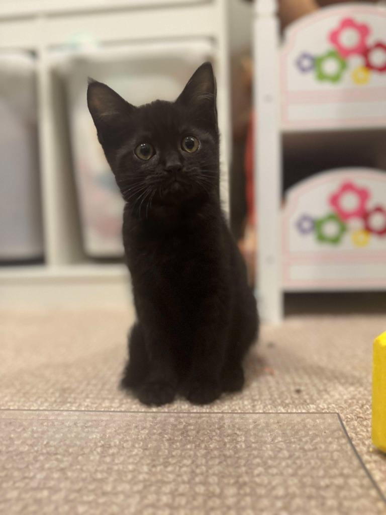 Darkfoot is a curious little explorer with a big heart! This sweet kitten loves nothing more than a smooch and a snuggle after a good play session. With a playful nature and a gentle soul, Darkfoot will quickly become the heart of any home.