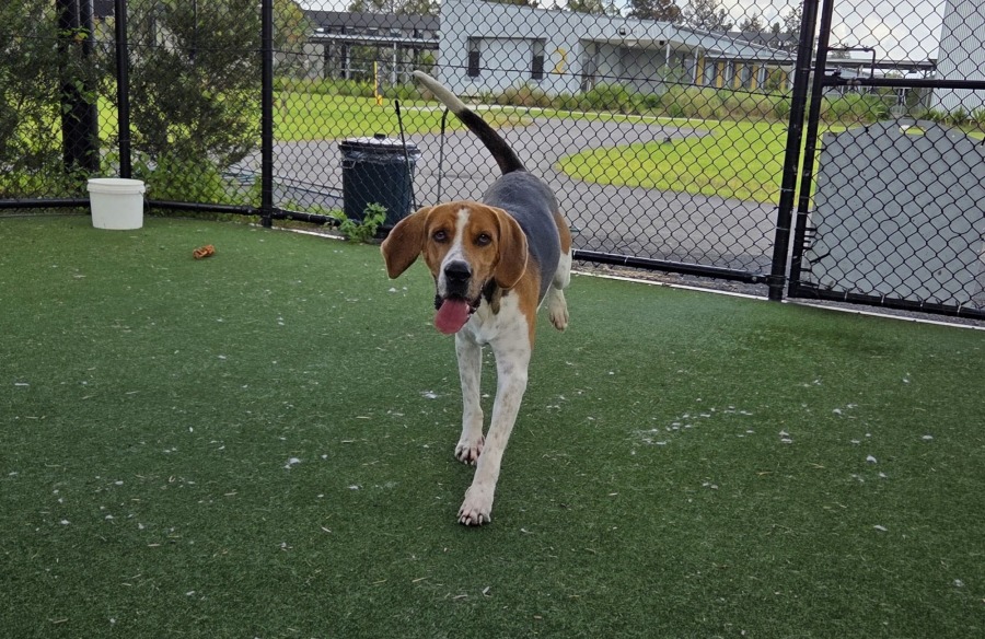 Mouse is a spirited, energetic hound bursting with personality! Strong and pully on the lead, he is looking for a dedicated owner who understands hound traits and can channel his enthusiasm and stubbornness into positive behaviours.