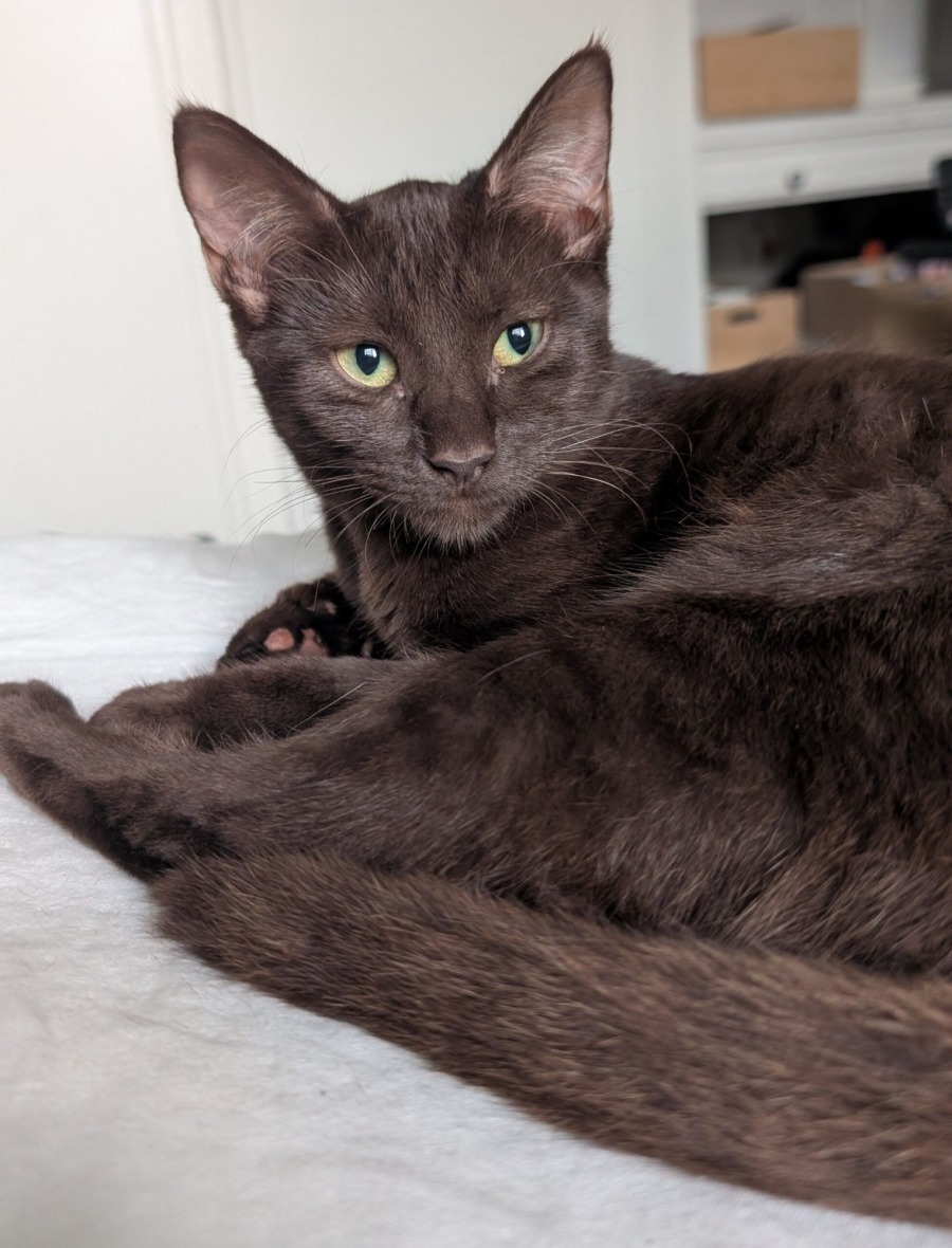 Nimbus can still be a bit cautious. If she’s startled by a loud noise or sudden movement, she may scurry into a little hidey hole, but it won’t be long before she comes back out to be with her people. Even her first night, she snuck out of the setup room and found her way into the main bedroom, choosing her own cozy little cat house bed to sleep in. She’s braver than she lets on!