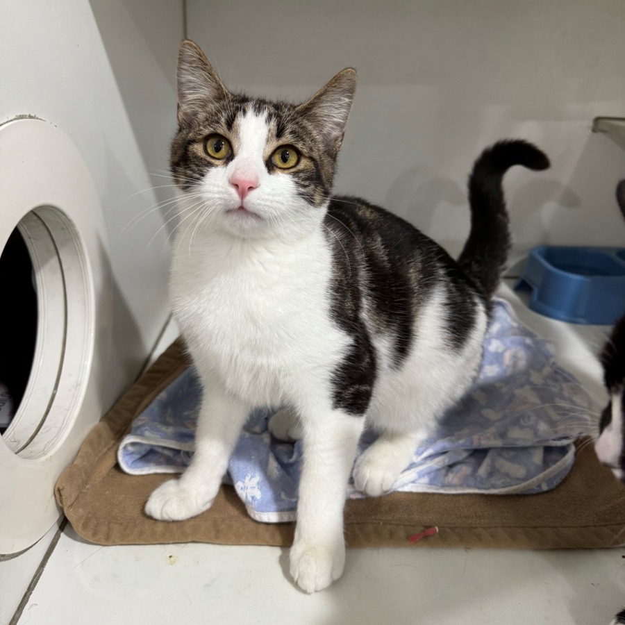 Meet Peanut – the tabby and white kitten with a whole lot of heart wrapped in a small, fluffy package. At just 5 months old, he’s the perfect blend of curious, playful, and oh-so-snuggly.