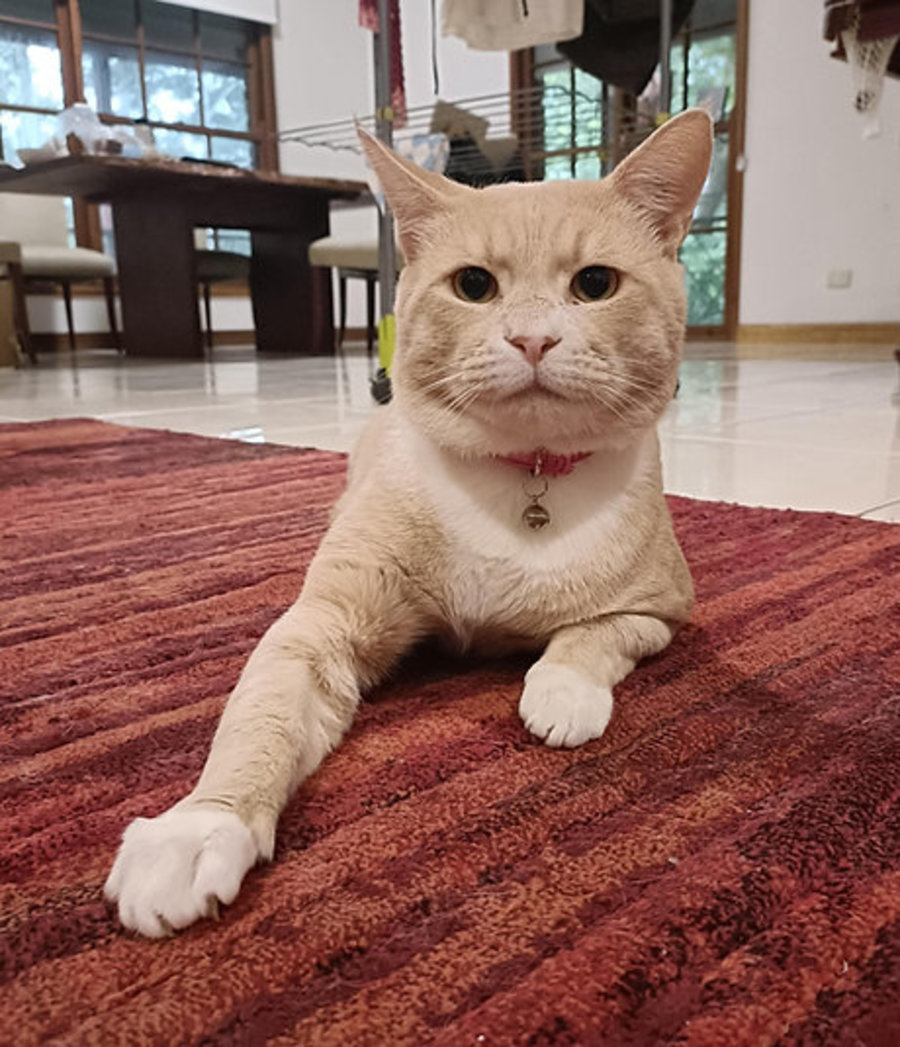 Garfield loves sleeping with you, quietly lying by your side. If you reach out to him, he'll rest his head in your palm, and sometimes he'll roll onto his back, inviting you to give him belly rubs.