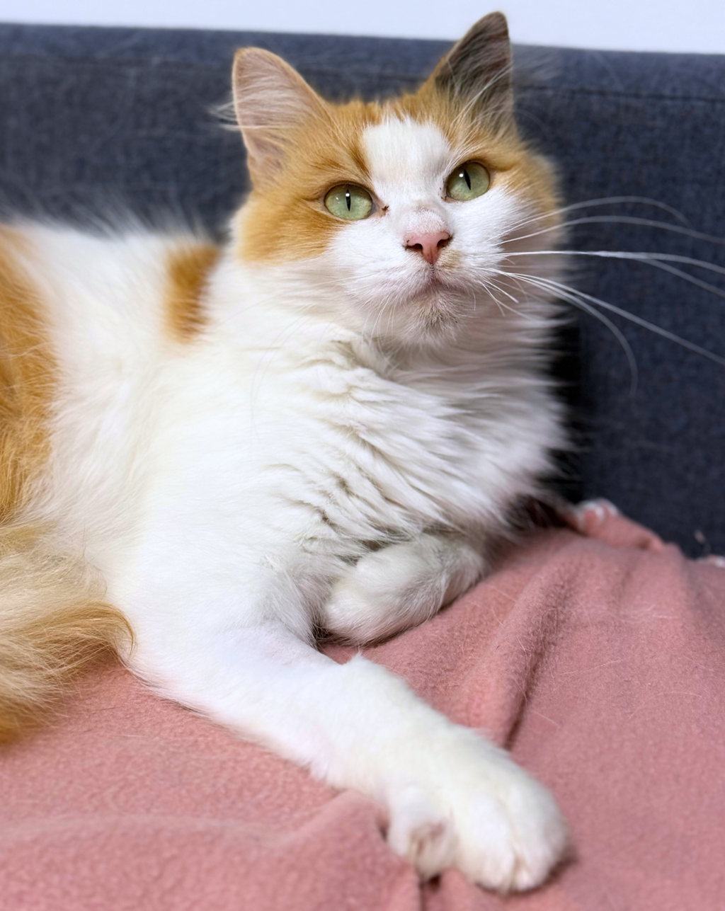 She enjoys gentle pats and sitting beside you on the couch, purring softly. While she's not a big lap cat, she will let you pick her up for some snuggles and will politely let you know when she's had enough.