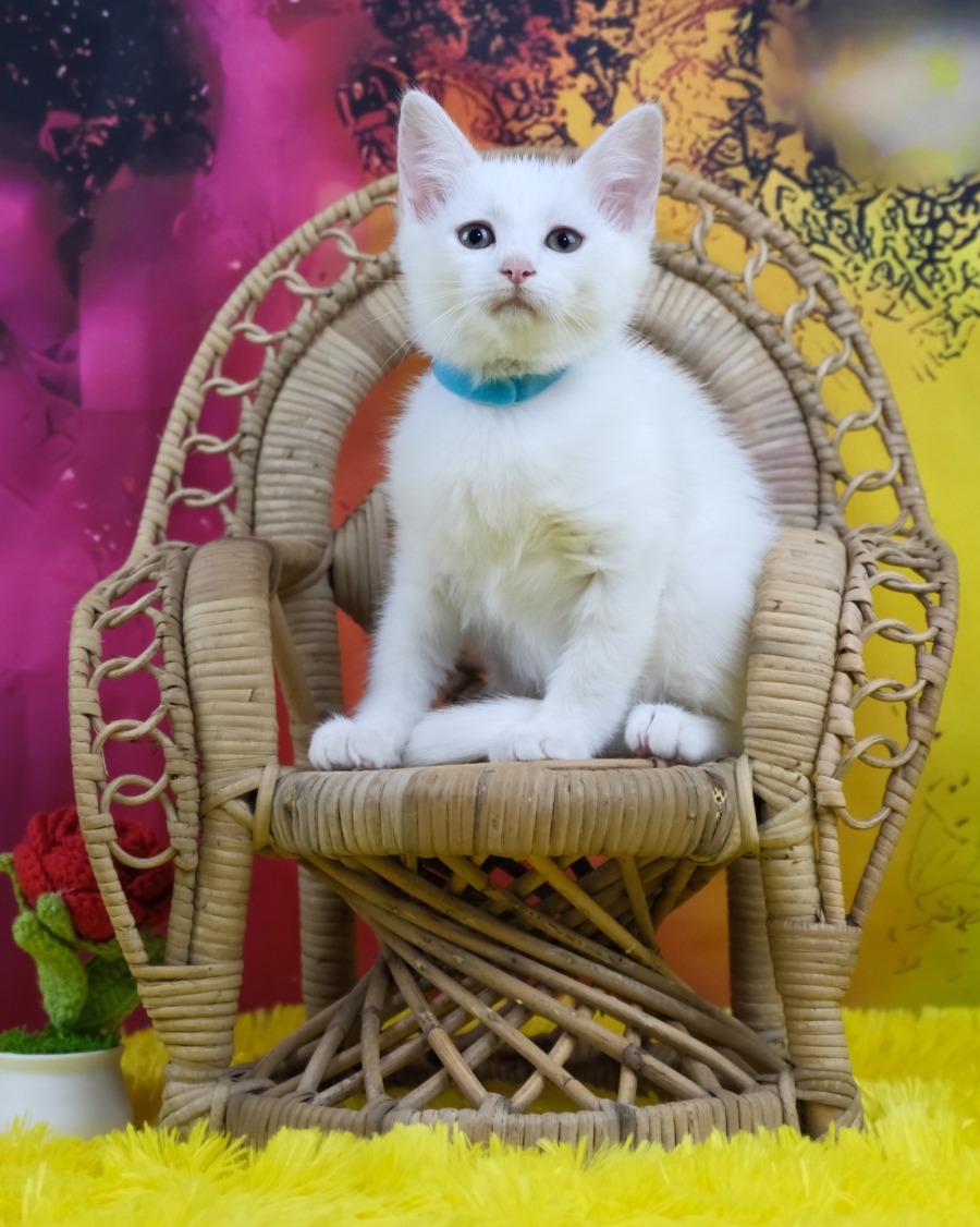Meet Cotton, the softest, fluffiest little acrobat you’ll ever encounter. This dazzling white Domestic Short Hair kitten is a vision of elegance—when she isn’t scaling the tallest cat tree in sight or balancing on the edge of a bookshelf like a tiny daredevil. If there’s a high perch or an unexpected vantage point, Cotton sees it as her next conquest. Gravity? Never heard of it.