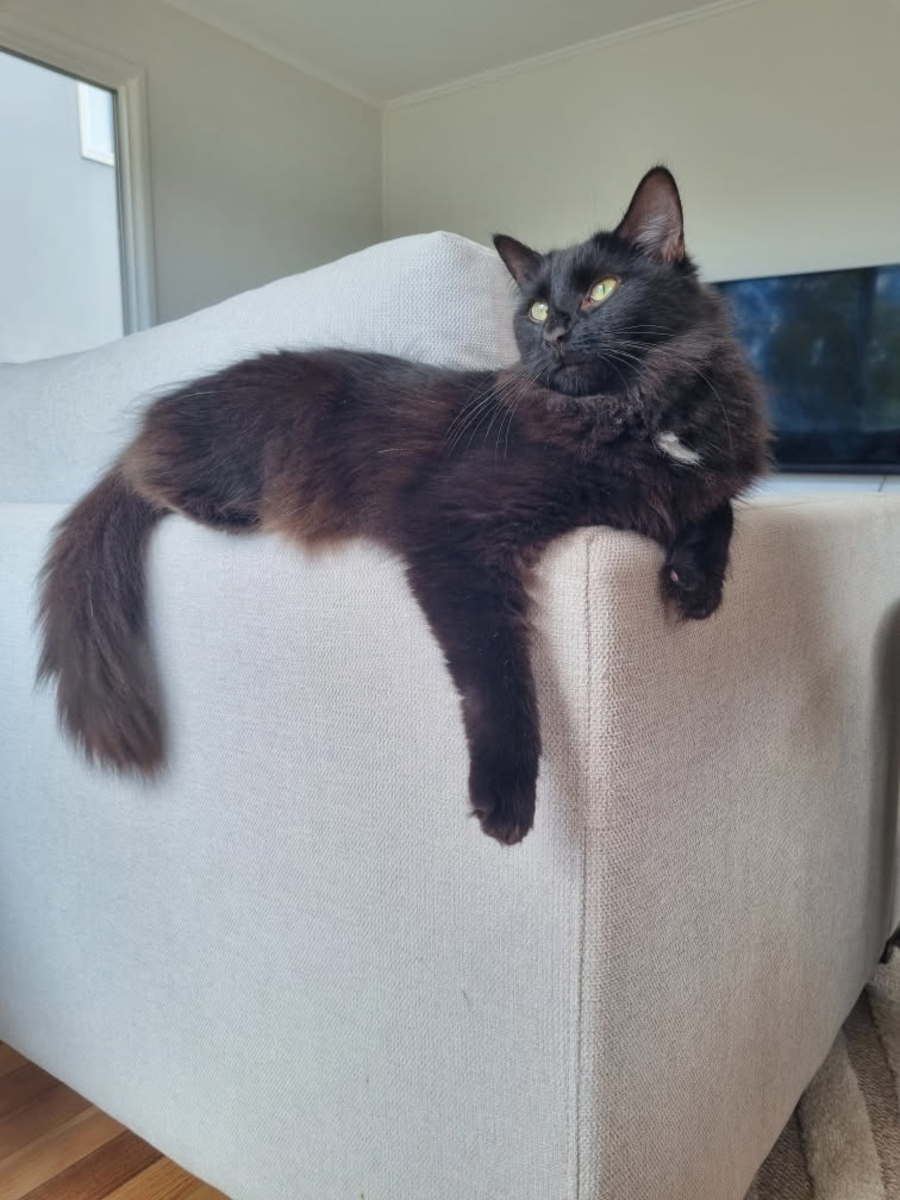 Bella is a domestic medium haired cat. She has a beautiful black coat, which is long in areas such as her fluffy tail.