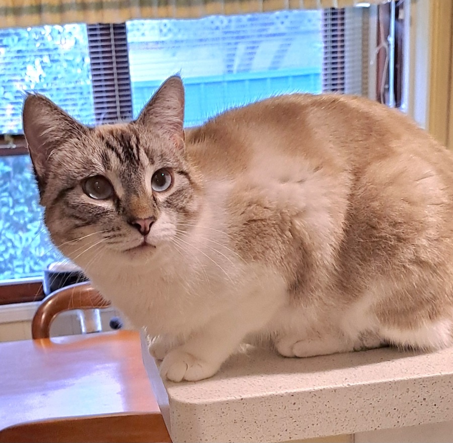 Cecile is a Lynx Point Siamese X cat. She has gorgeous blue eyes that are slightly cross-eyed. This is something typical of Siamese cats making Cecile look super cute.