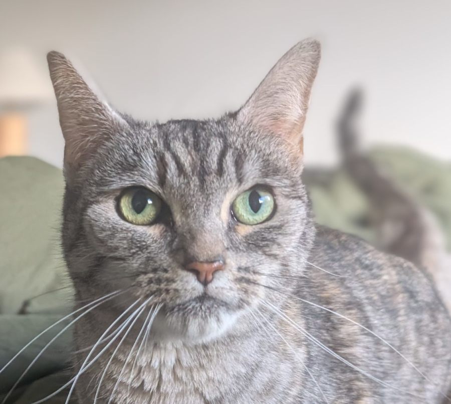 She is a Domestic shorthaired cat. With a beautiful and healthy silver tabby coat.