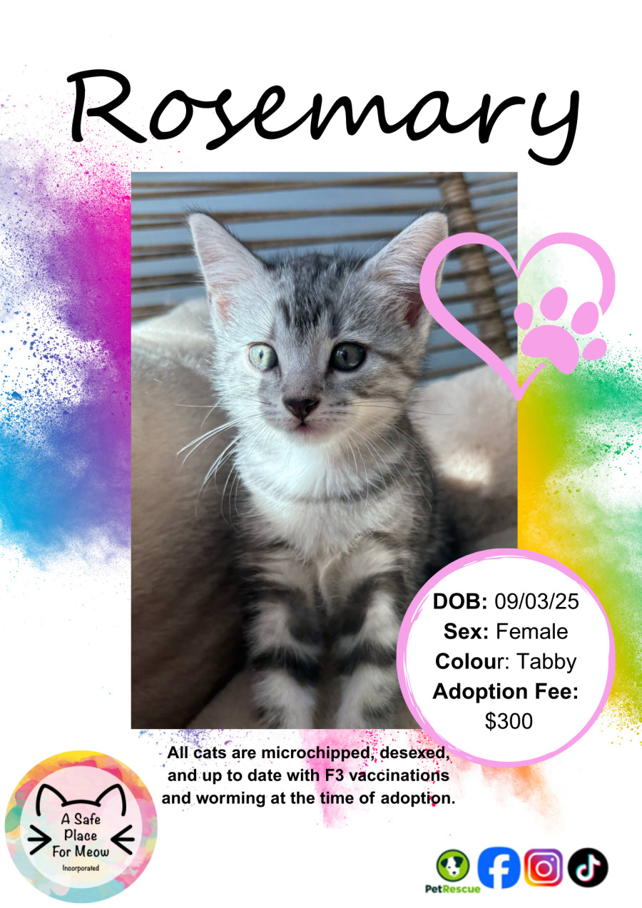 If youâre after a kitten who brings calm joy into your home, who will curl up next to you at the end of a long day, and who will charm guests with her serene little meows, Rosemary is waiting for you.