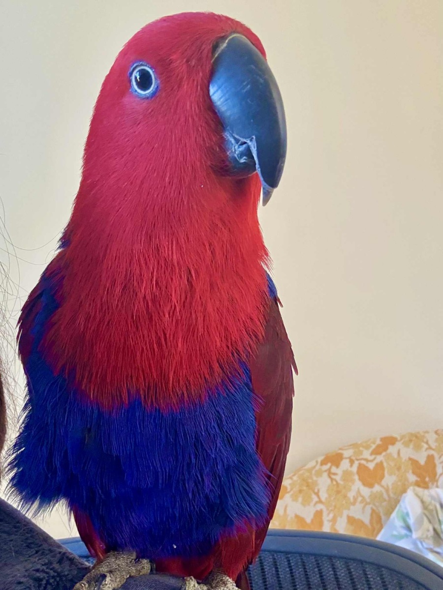 Ellie-May is a total sweetie, who charms everyone she meets. She loves to get on your shoulder and hang out, and is learning about different fruit and veg. Ellie-May is only a young adult. Many people do not consider eclectus parrots to be good for beginners, as Ellie is likely to go through a hormonal change at 2-3 years of age. This can be challenging for owners, so some parrot experience is a bonus. Her new family will need to be prepared for Ellie-May to be part of their lives for the next 40 or so years.