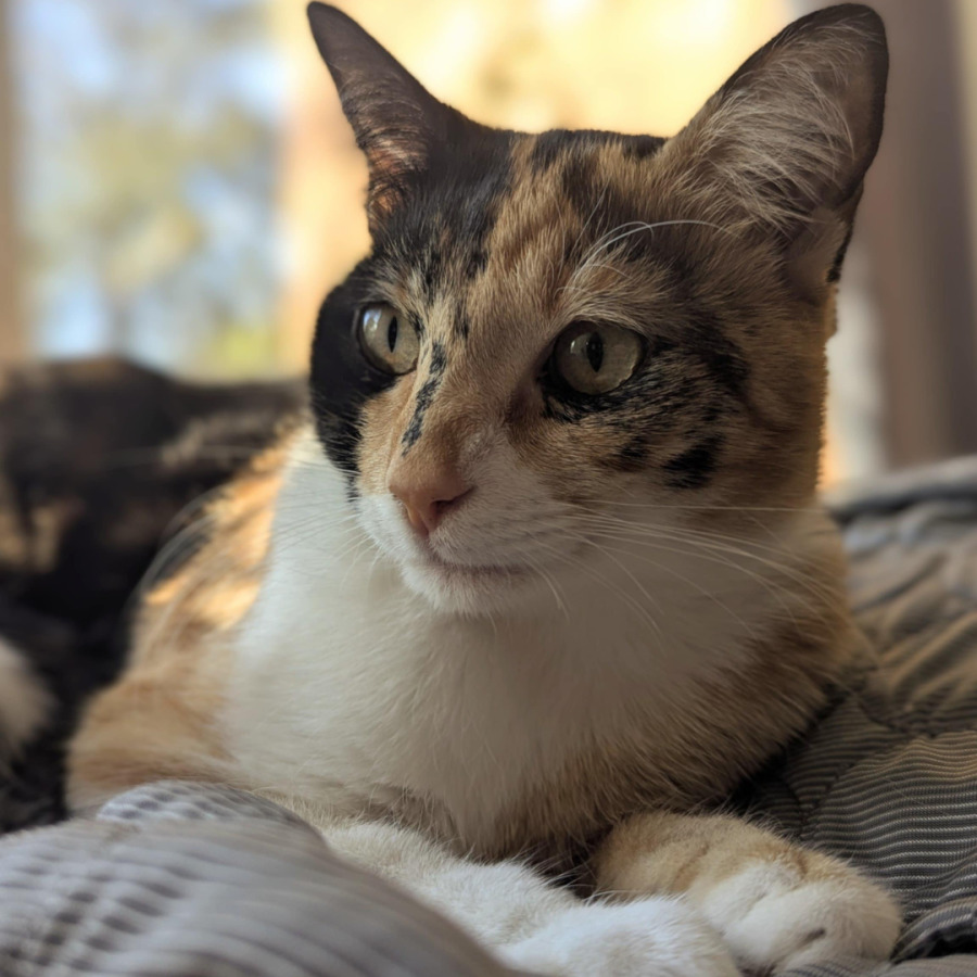 I’m the smaller, more curious one of the two. I can be a little shy and nervous around new people, loud noises, and busy places, but once I trust you, I’ll turn into a cuddle bug. My purr is loud and soothing, and I love snuggling up with my favorite humans. I do enjoy playing now and then, though I’m not very active. I’m also excellent with my litter box, but if the tray is shallow, I might make a little mess (it’s just part of my charm!).