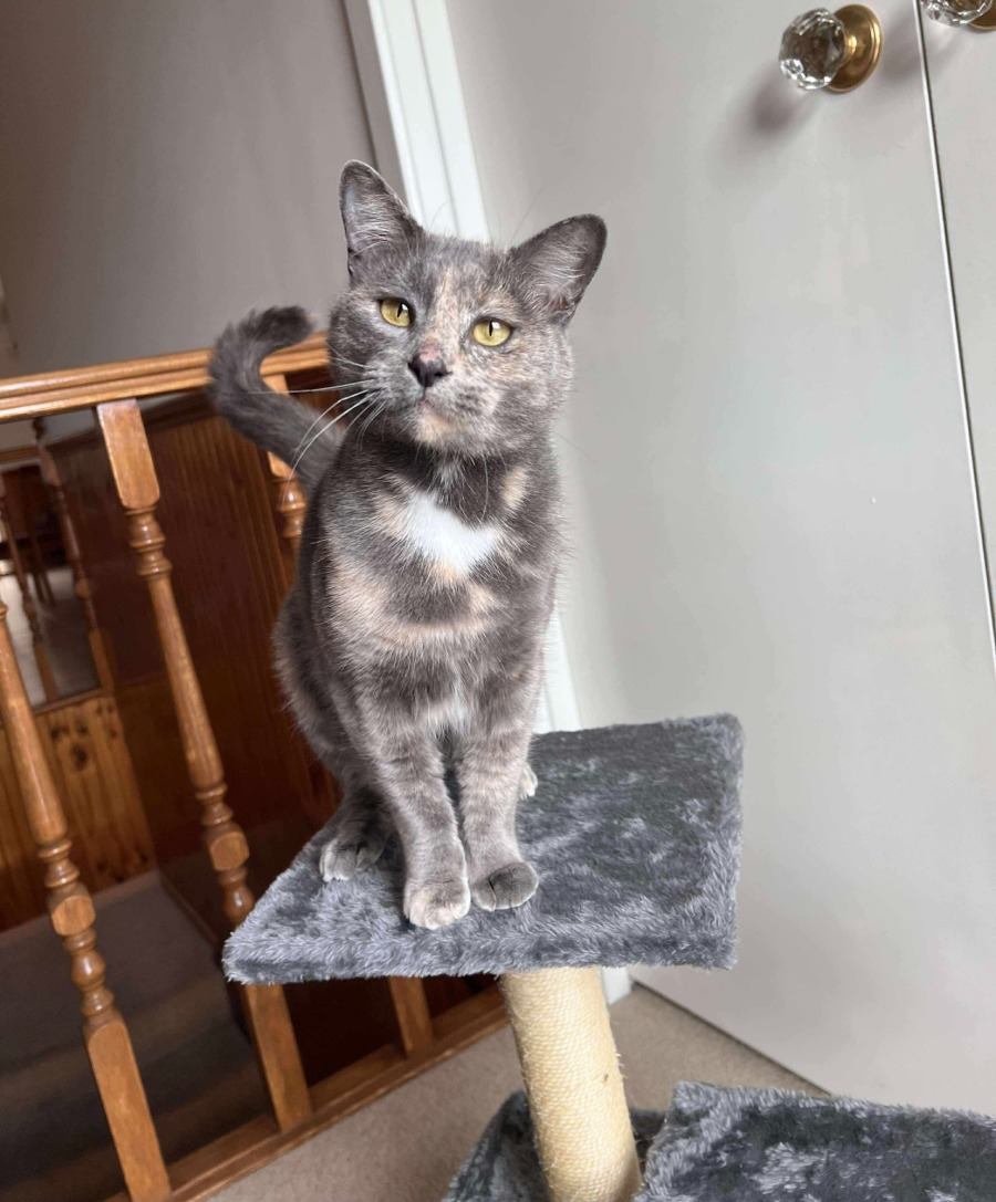 Addie may be small in size, but she’s overflowing with personality. This sweet girl is a delightful mix of adventurous spirit and affectionate charm. Always the first to investigate a new nook or chase after a fluttering shadow, Addie’s curiosity is as boundless as it is endearing. Whether she’s darting around the house on a playful mission or quietly observing the world with those wide, intelligent eyes, she brings a spark of joy to every moment.
