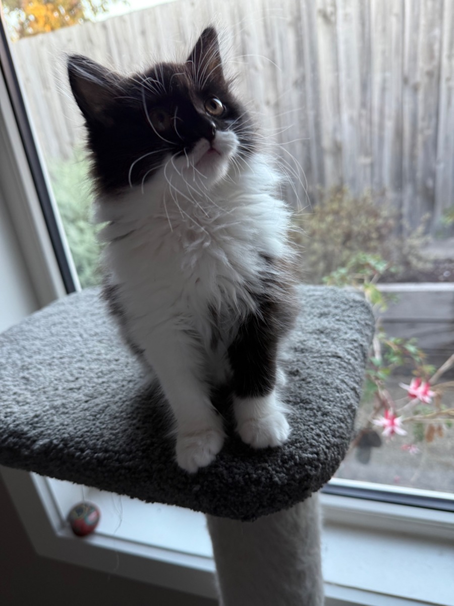 Felicia loves a cuddle and when she grows up would like to be a hairdresser, she will jump up on the back of your chair and play with your hair like the best head massager. She loves to play with her siblings running zoomies or playing ball or bunny hopping across the floor to play attack and run away. She loves a cuddle and a belly rub or just to chill out on her own. She has had interaction with older cats and small children.