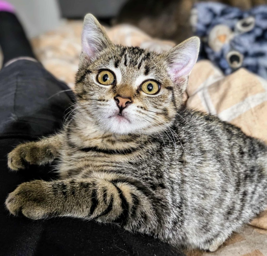Kaida’s journey started in the unlikeliest of places — found alone under a commercial dumpster, weighing just 400g. Thanks to lots of love and care, this brave little tabby has blossomed into a happy, healthy kitten who is now ready to find her forever family.