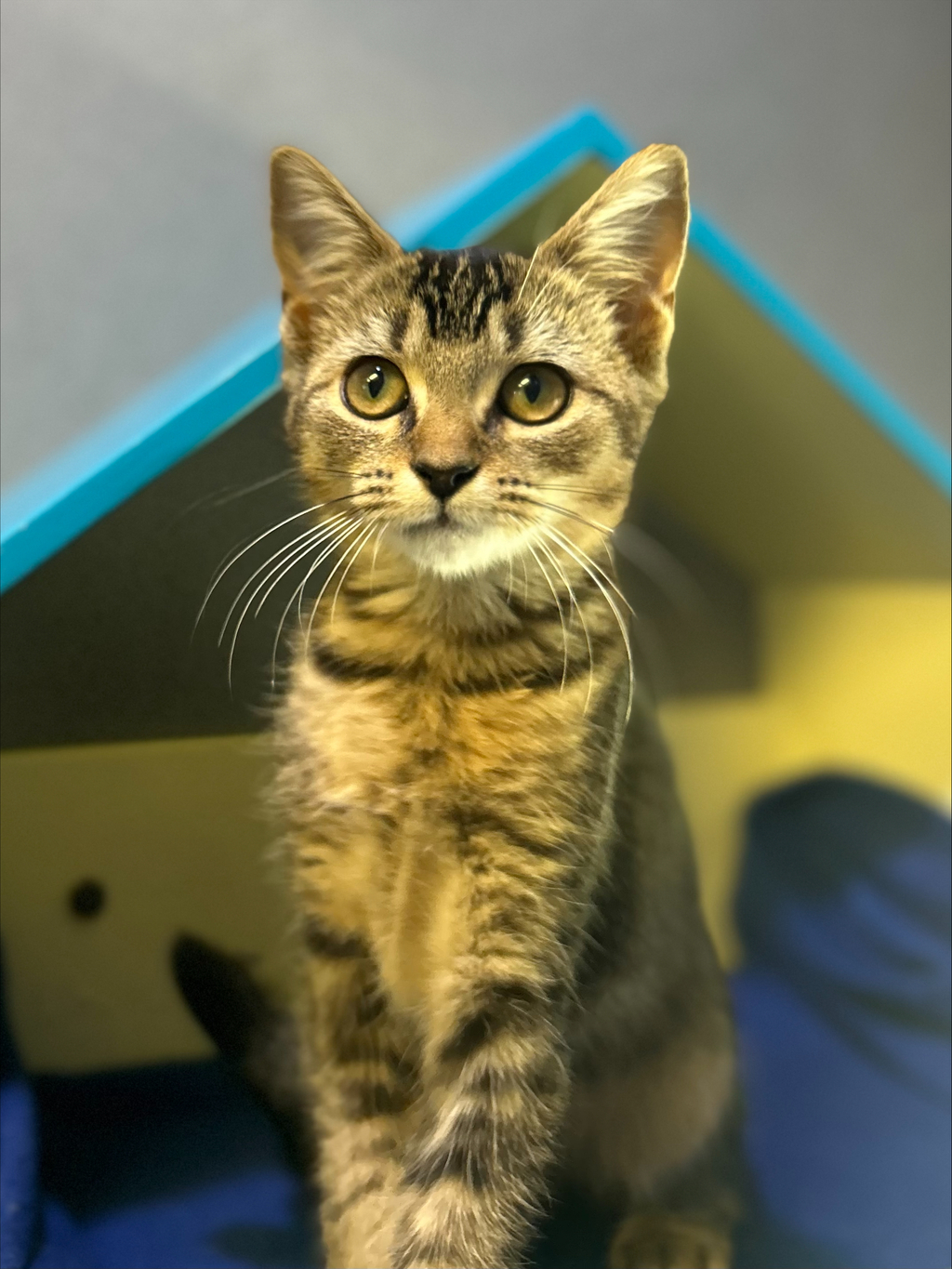 I am a very adventurous, outgoing kitten. My days are filled with curiosity and playfulness. I love exploring new toys and finding hidden treats. I'm full of energy and can't wait to share it with you. I'm sweet and friendly, always ready to greet you with a purr. Adopting me means endless entertainment and a loyal companion. I promise to bring joy, laughter, and a whole lot of love to your home.