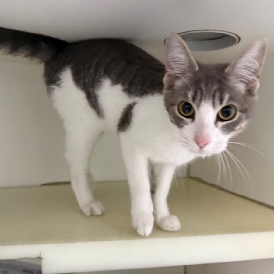 Say hello to Cosmos, the sweetest little star in the galaxy! 🌟 This 7-month-old grey tabby and white kitten is bursting with playful energy and kitten curiosity. From zooming through the room to batting at feather toys, Cosmos turns every day into an adventure 🎉.